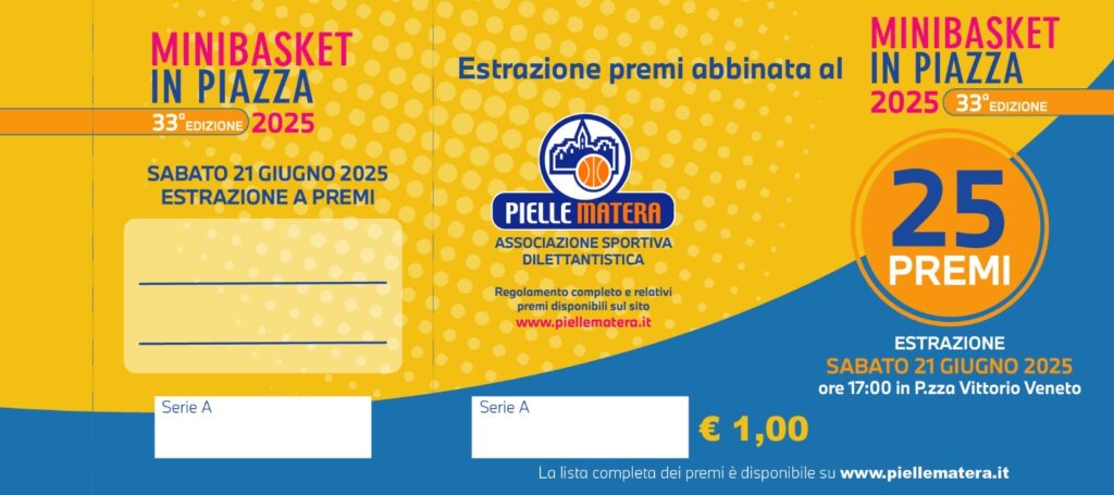 Sabato 21 Giugno 2025 alle ore 17:00 verrà effettuata l’estrazione dei 25 premi della lotteria abbinata alla 33° edizione del Torneo Internazionale Minibasket in Piazza 2025. Compra il tuo biglietto e tenta la fortuna!!!